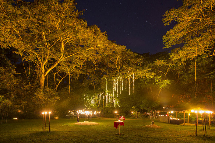 - Tuesdays, Thursdays ONLY • Return Hotel Coach Transfers from Port Douglas • Flaming arrival and candle lit forest setting under a silk lined marquee with hand made crystal chandeliers • Sparkling wine and Hors d’oeuvres on arrival at Pre Dinner Drinks • Seven dish plattered banquet served to your table seated under a magnificent black silk lined marquee highlighted by crystal chandeliers • Aboriginal Cultural Performance featuring didgeridoo, storytelling and song • Australian sparkling wine, red and white wine, beer and soft drinks • Shared tables of ten so you can enjoy the company of other intrepid travellers