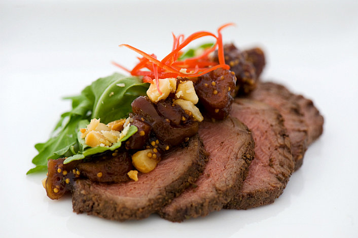 Lemon myrtle infused kangaroo loin on a bed of wild rocket & toasted macadamia nuts garnished with homemade fig chutney