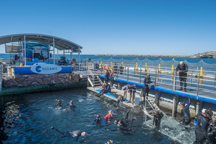 Boat transfer to and from In Sea Aquarium, 2 hours to swim, feed and interact with the tuna and other marine life, the use of a wet suit, booties, mask, gloves and hood. Also includes your V.I.P Island Discovery Seafood Tasting Platter and premium SA wine.