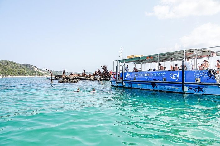 Full day cruise to Moreton Island, Marine Discovery Cruise including dolphin spotting, tropical buffet lunch, morning tea, snorkelling tour with equipment, free time on the beach.